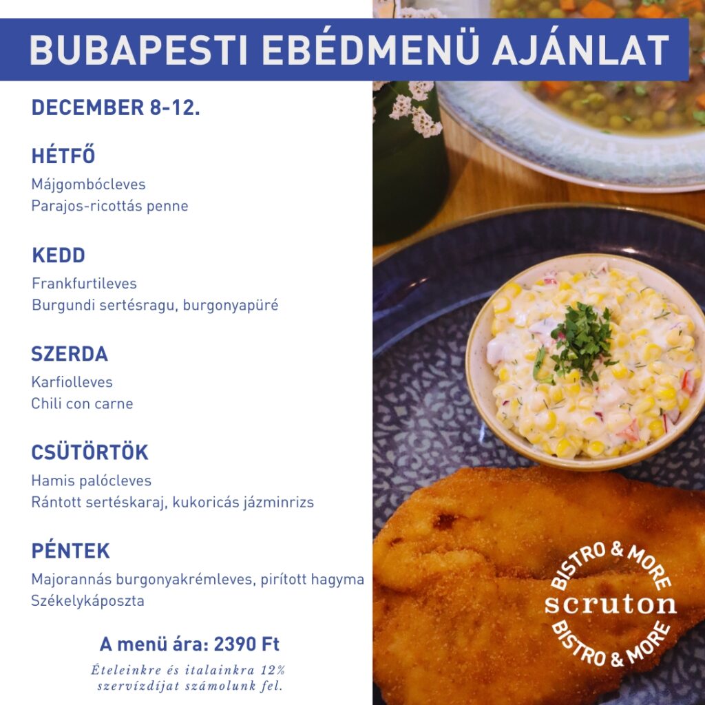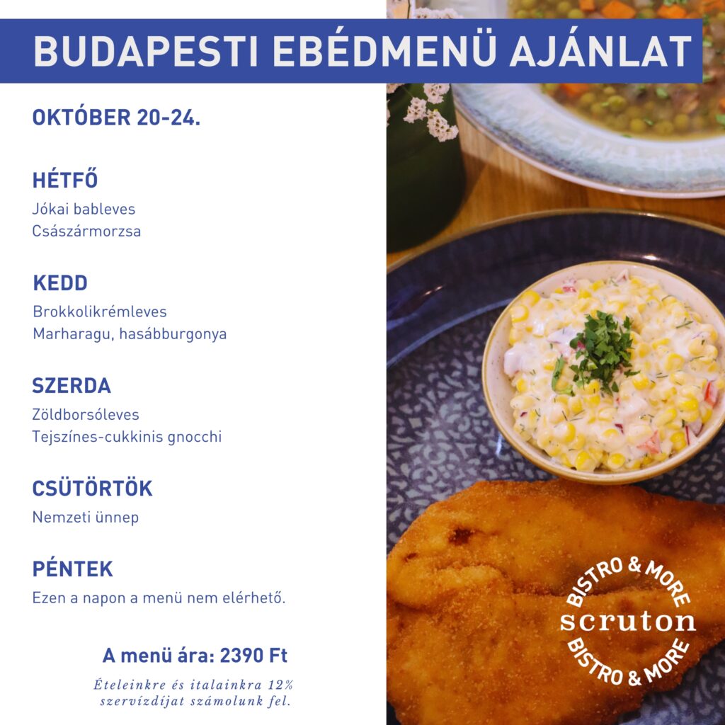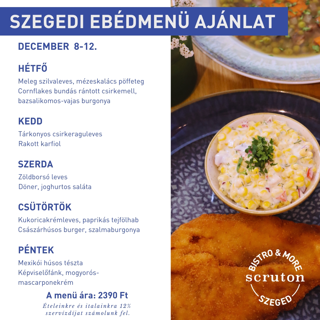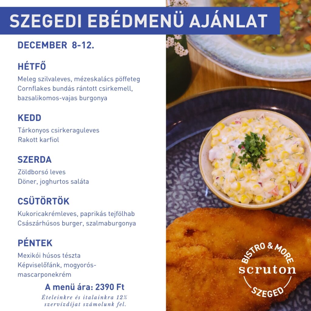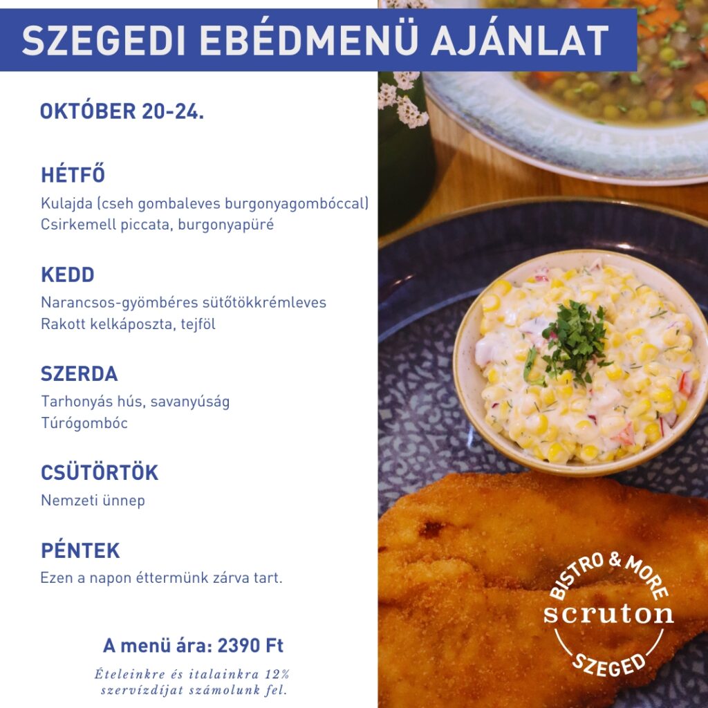 Minden hétköznap naponta változó ebéd kínálattal várjuk vendégeinket a Scruton V.P., a Scruton MCC és a Scruton Szeged helyszínein. A menü kialakítása során törekszünk arra, hogy házias, vendégeink számára kedvelt ételek kerüljenek fel menünkre.