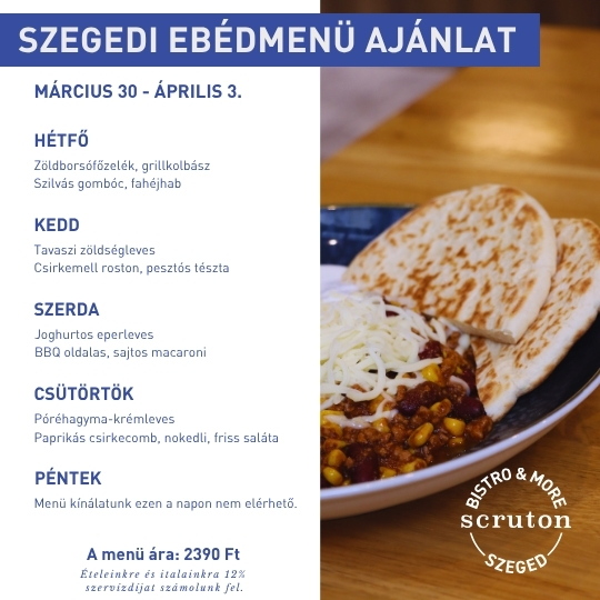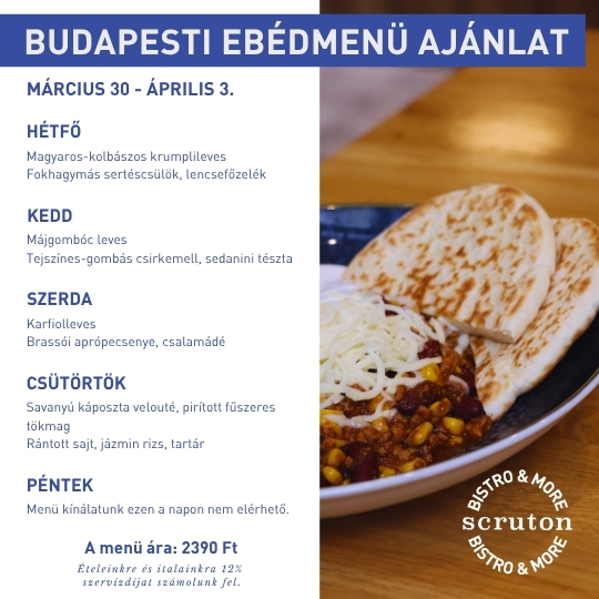 Our daily lunch menu is available at Scruton V.P. and Scruton Feneketlen-tó in Budapest, and at our Scruton Szeged location in Szeged. When creating the menu, we strive to include homemade dishes that are popular with our guests.